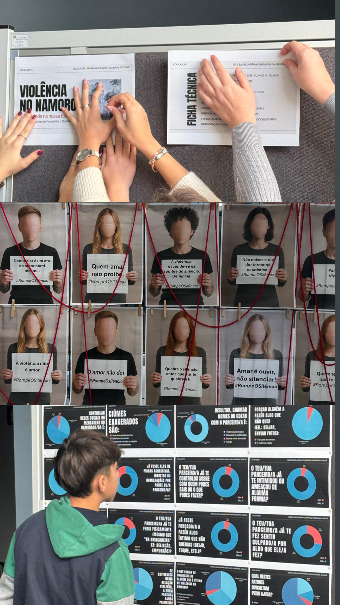 Para envolver a comunidade escolar, os/as alunos/nas elaboraram um questionário dirigido a outras turmas, cujas respostas revelaram percepções e preocupações dos/as jovens. As conclusões foram apresentadas na exposição #RompeOSilêncio, no átrio do CTE, com trabalhos de 2 turmas do 9.º ano, culminando na comemoração do Dia dos Direitos Humanos e reforçando a importância do respeito, da igualdade e da cidadania.